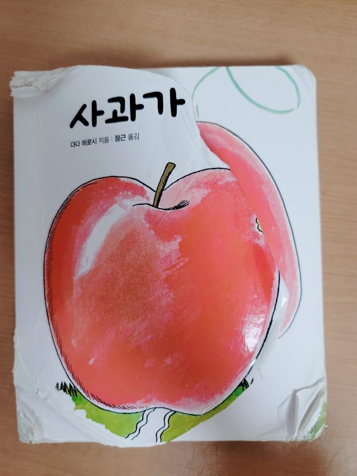 이런저런 책을 수업중 접했지만 아이가 태어나면 첫 책을 준다면 사과가 쿵! 이 책을 보여줘야지 했답니다. 6개월 경에 아이는 처음 이유식을 접했어요. 처음 이유식을 하고는 많이 먹지도 않았는데 변비에 고생하더라고요. 그럴 때는 물을 더 주거나 단맛을 느낄 수 있는 과일이 좋다고 하더라고요. 그래서 사과도 갈아서 먹여봐 주었습니다. 처음 색다른 음식을 접하고 그 경이로워하는 모습은 정말 사랑스러웠어요. 한동안은 사과를 아주 잘 먹었습니다. 그래서 사과 책도 주어야지 하는 달달한 마음이 들었어요.